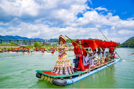 202082311點,世界第一風雨廊橋”——“重慶黔江濯水風雨廊橋下寬闊而清澈的阿蓬江面上,身穿民族服裝的阿哥阿妹俏生生地站在佩戴紅綢和大紅花的喜船上,在艄公的牽引下上演一場別開生面的鵲橋相會,吸引了來自全國各地的游客駐足打卡拍照。